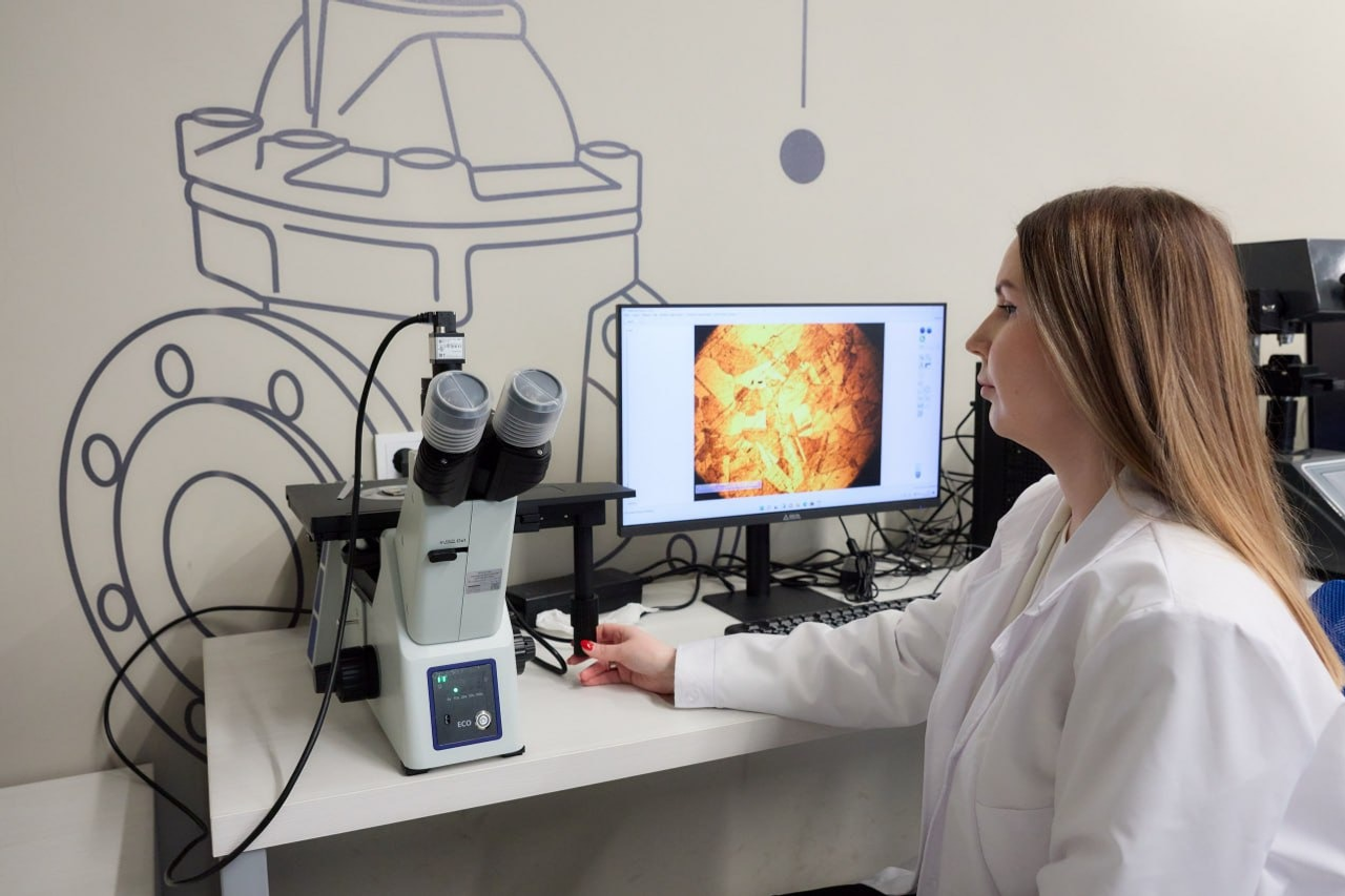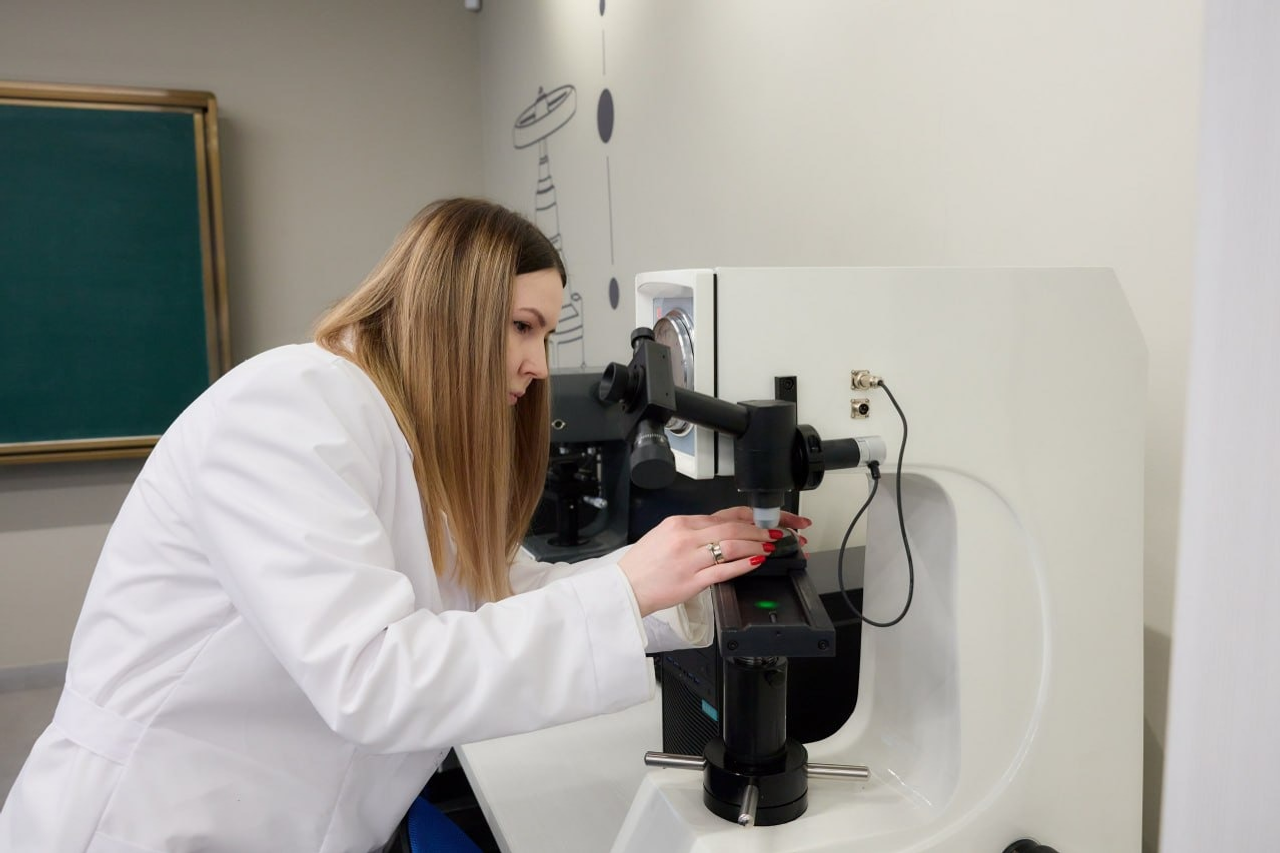 В составе лаборатории целый комплекс современного оборудования. Отрезной станок и шлифовально-полировальная машина помогают правильно подготовить образцы для дальнейших исследований. Муфельная печь и сушильный шкаф предназначены для термической обработки, а гидравлический пресс и универсальная испытательная машина — для деформационной. С помощью универсального твердомера и микротвердомера можно проверять качество проведенной термообработки и контролировать прочность покрытий. Оптический микроскоп позволяет изучать строение материалов — микроструктурный анализ помогает объяснить изменение их свойств.